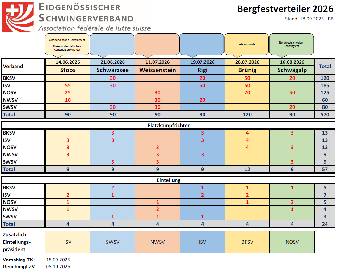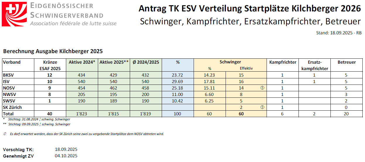 Ebenso wurden die Anzahl Schwinger und Kampfrichter pro Teilverband für das Kilchberger 2026, auch hier wie von der TK ESV vorgeschlagen, bestimmt: